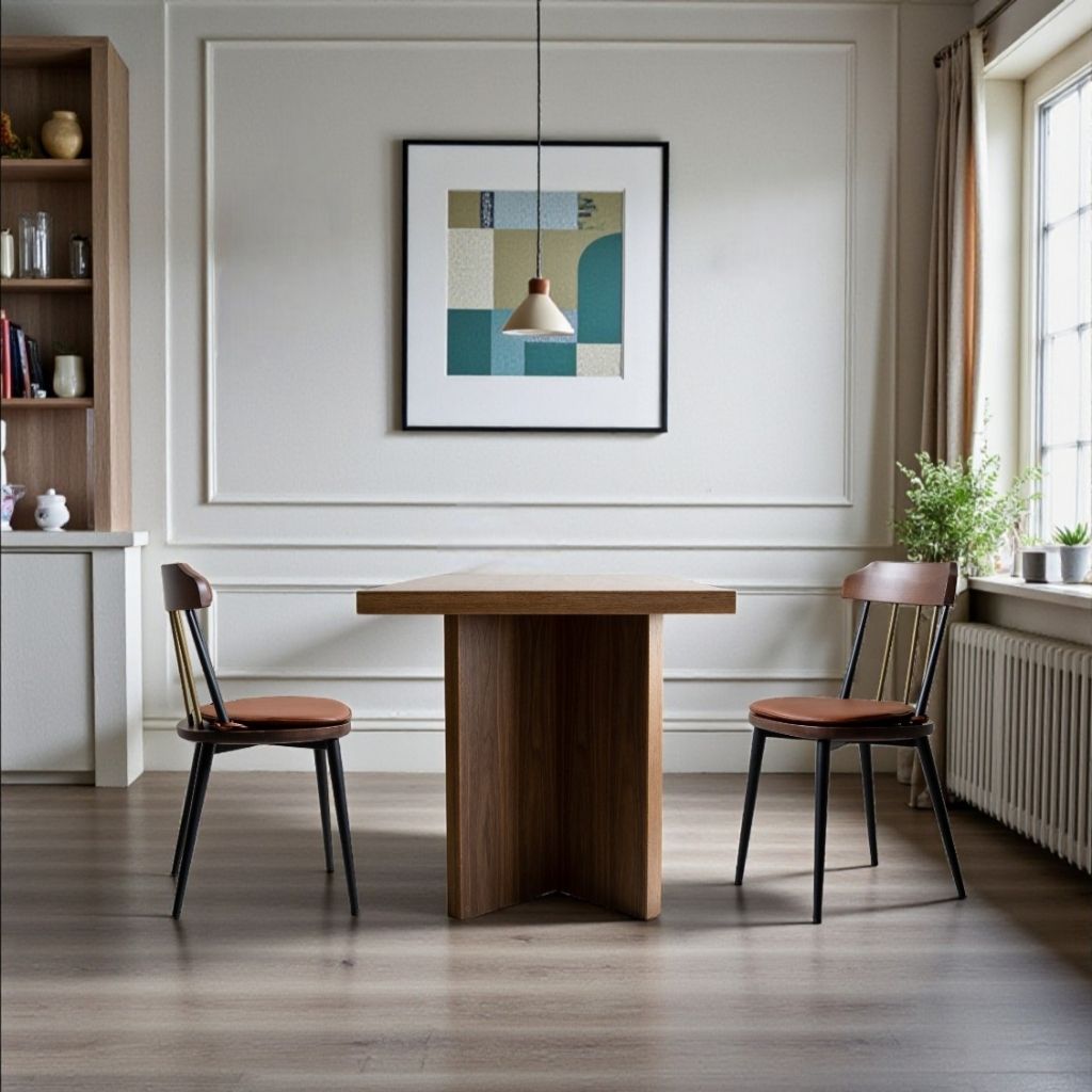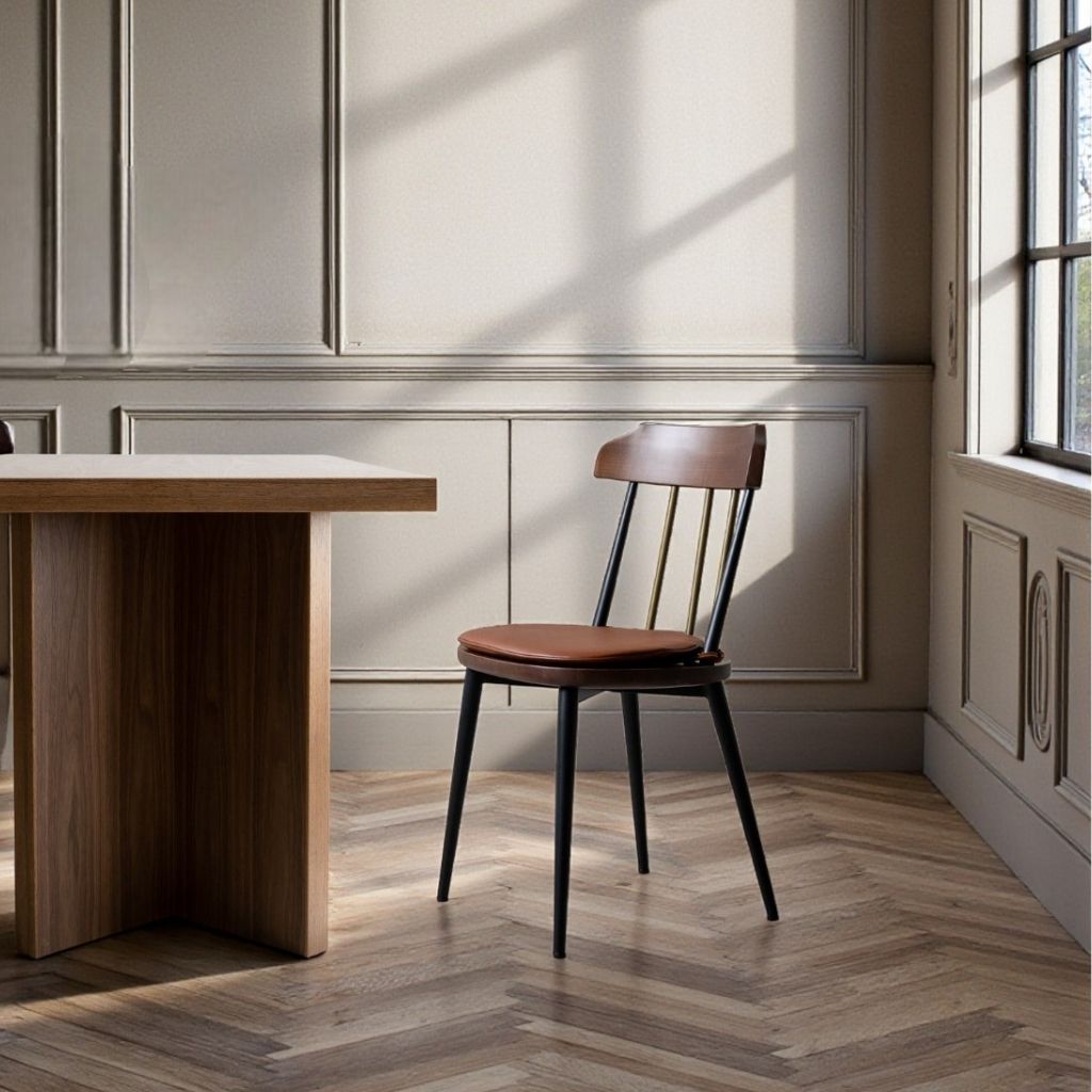 従来の無垢材で作られたウィンザーチェアとは異なり、ウェンディチェアはくるみ材の座板と金属製の円管脚で構成されています。金属要素の追加により、製品の構造はより堅固で安定性が増しました。