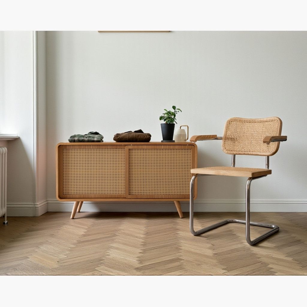 ラタンチェアなど天然素材のに合わせることでラスティックスタイルや、引き戸ということもあって、日本の古家具の趣も感じられるので、和の空間にもマッチします。