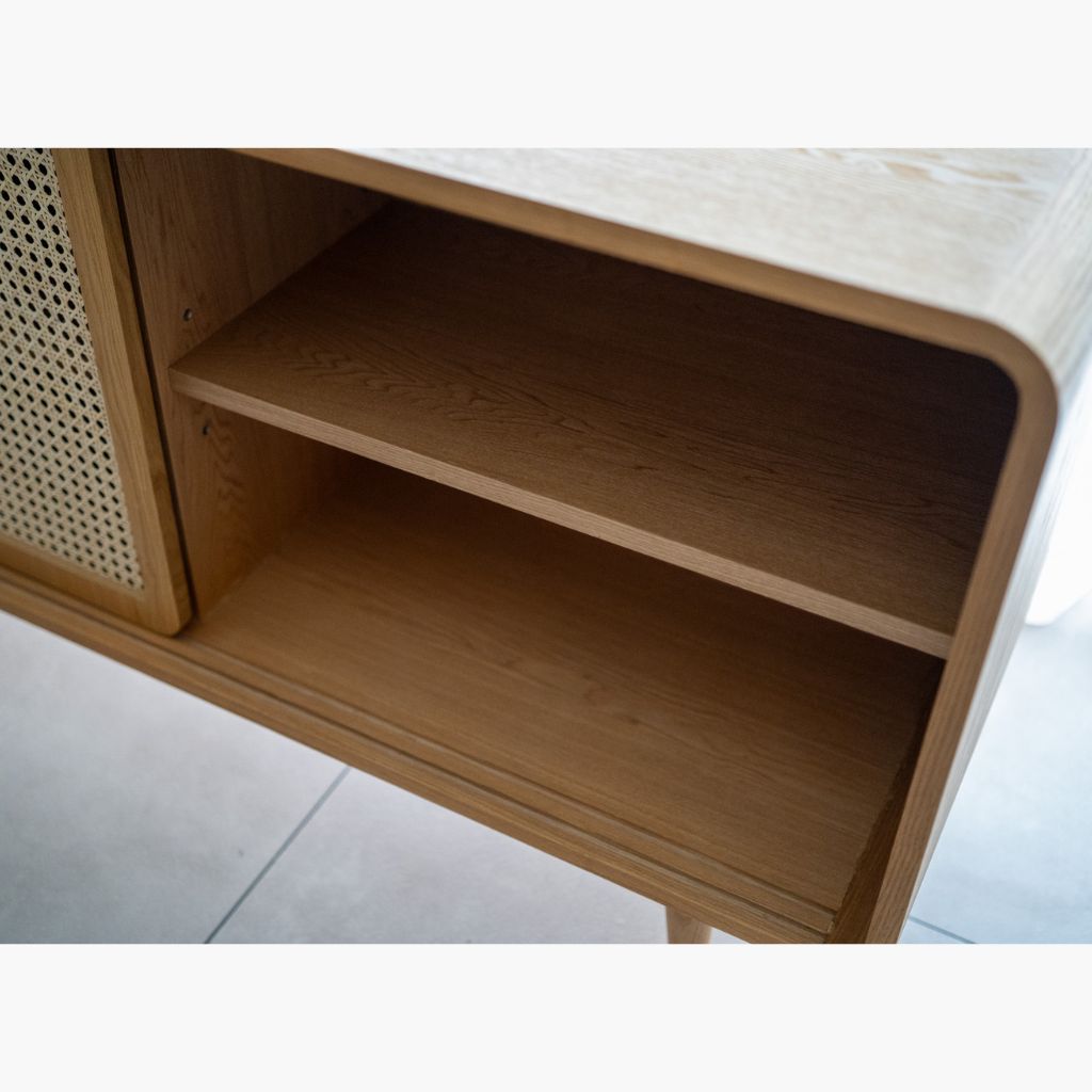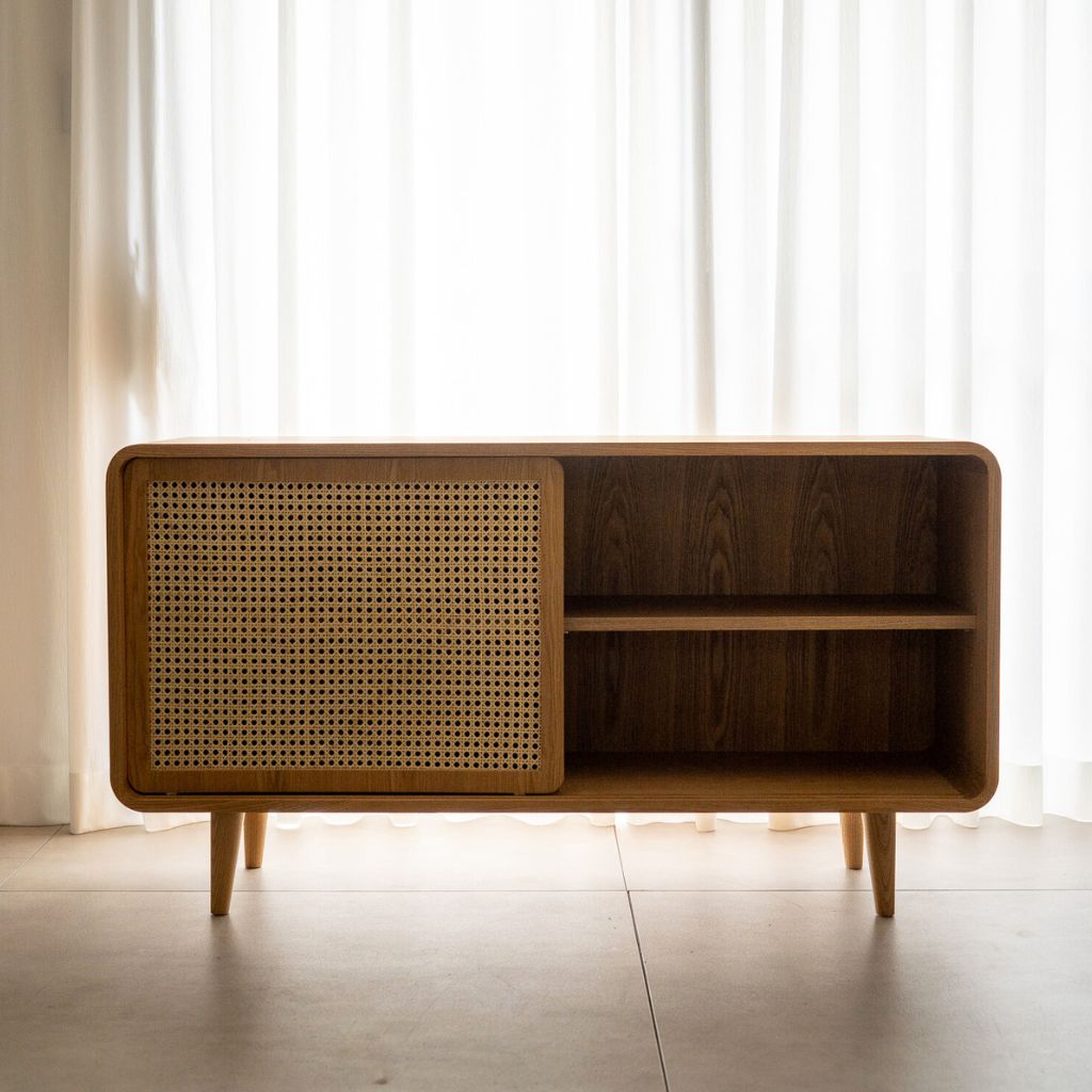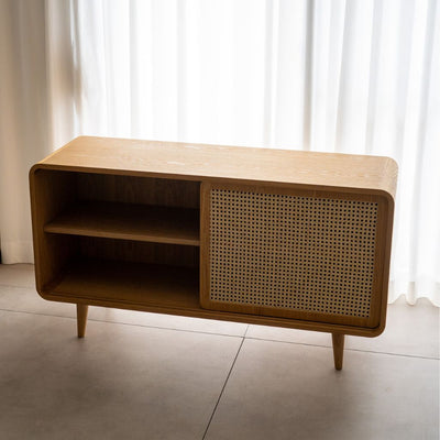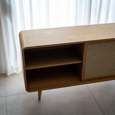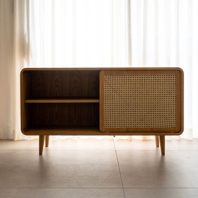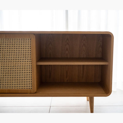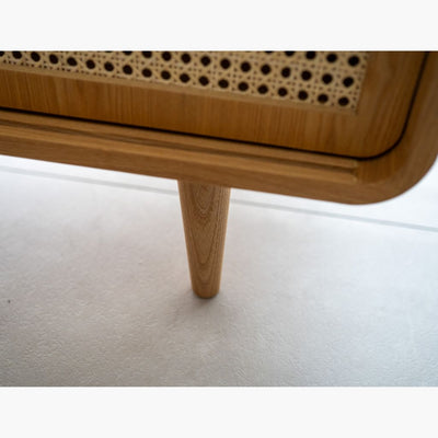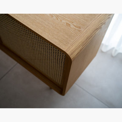 シンプルでありながら、本体の角は丸みの帯びたデザイン。さらにラタンの引き戸が特徴的なキャビネットです。